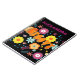A colourful range of flowers --- flower power --- in vibrant blues yellow and pinks on a black background.