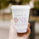 Celebrate your groovy girls very first birthday party with our playful lavender chequered 'ONE RAD CHICK' birthday disposable paper cup tableware. This design features an easy-to-love happy face with peace sign glasses and dusty pink wavy chequered patterns.