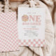 Celebrate your groovy girls very first birthday party with our playful pink chequered 'ONE RAD CHICK' birthday invitation. This design features an easy-to-love happy face with peace sign glasses and dusty pink wavy chequered patterns.