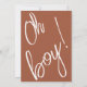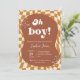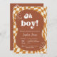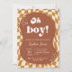 Get ready to celebrate your little man with this trendy and groovy "Oh boy!" baby shower invitation! This unique design features a warm terracotta/burnt orange color palette, a wavy retro checkerboard background, and fun celestial moon and stars accents. Perfect for a modern, boho, or 70s-inspired shower theme. Easily personalize the date, location
