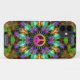 Custom phone cases made with bright psychedelic rainbow colours, geometric patterns centred with a pink and orange peace symbol | art by webgrrl.biz
