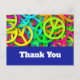 Thank you postcard with a sixties vibe. Cool peace signs in bright and vibrant neon colours featuring all the colours of the rainbow.