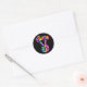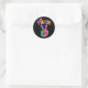 Groovy round sticker features retro style tie dye peace sign hand with curved text on black background. Use as a seal for favour bags, envelopes and gifts.