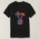 70's retro look t-shirt design features a groovy tie dye peace sign hand with curved text.