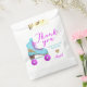 Groovy and fun skating theme birthday party favour bag featuring illustration of a pink and blue roller skate. The text says "thank you for rolling with us."