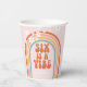 Retro inspired Six is a Vibe 6th birthday party paper cups with hippie style rainbow, daisies and boho fonts and colours.