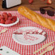 Retro inspired Groovy third birthday plates with 70's style daisies and boho fonts and rainbow,