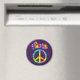 70's retro look round magnet features a groovy tie dye peace sign with curved text on dark red background