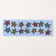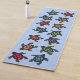 This yoga mat is light blue with a group of abstract black turtles with colourfully marked shells in colours of purple, blue, orange, green, red, and yellow.