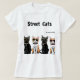 A group of street cats wearing sunglasses and sitting on a city sidewalk.