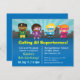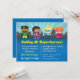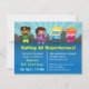 Plan a superhero party and invite your children's guests to come dressed in their favourite superheroes' costumes, capes and masks or use their creative minds to come up with their original superheroes concepts! This invitation has cute kids dressed in superhero costumes complete with masks and cape. A city skyline and blue sunburst decorates the background. Great for kids who love superheroes themes or dress up parties. Personalise easily with party details.