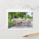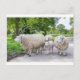 Group of white sheep and lamb on road in nature postcard