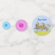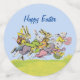 This table confetti has large circles with a group of Easter bunnies in pastel coloured clothing running in the grass carrying baskets with yellow chicks and coloured eggs. Customise the Happy Easter text with the template. Medium circles are pink with a bright pink Easter egg, small circles are blue with a blue Easter egg.