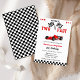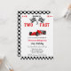 Two fast cars twin boys 2nd birthday race on these cute kids' birthday party invitations with a red car race. Cute race car theme for a 2nd birthday party featuring an illustration of a red vintage car with the words "Growing up too fast."