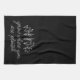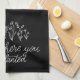 This design features a black kitchen towel with a white floral design and the message, "grow where you are planted."