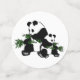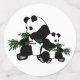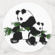 Panda mama sits eating bamboo while baby does as baby panda sees