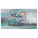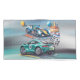A digital illustration of two racing cars in a celebratory theme. The top image shows a blue and yellow Le Mans prototype race car with the number "16" on its side, positioned on a racing track with red and white striped curbs. The car has aerodynamic features including a large rear wing, side pods, and front splitter. In the background, there are yellow and blue balloons floating, and a chocolate birthday cake with three lit candles and a blue balloon. The bottom image shows a metallic green race car with the number "14" on its side, featuring a sleek aerodynamic design with a large rear wing, side vents, and a checkered flag in its right side mirror. The car has a racing slick tire setup and is positioned on a racing track with yellow and blue racing lines. The illustration has a watercolor-style background with blue and yellow paint splatters. The overall composition creates a festive racing atmosphere with the contrast between the high-performance prototype and the GT race car.