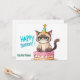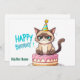 Celebrate birthdays with a humourous twist! This colourful cartoon card features a grumpy cat wearing a festive birthday hat, sitting atop a pink frosted cake with sprinkles. The cat’s piercing blue eyes and unimpressed expression add charm and humour to the design. A playful, slightly messy “Happy Birthday” sign hangs in the background, enhancing the celebratory feel.