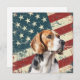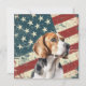 A watercolor portrait of a beautiful Beagle Hound Dog is placed against a grunge background of the USA flag. The back of this all occasion flat card has a text field for you to customize.