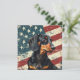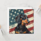 A watercolor portrait of a beautiful black and tan Dachshund Hound Dog is placed against a grunge background of the USA flag. The back of this all occasion flat card has a text field for you to customize.