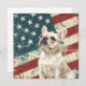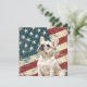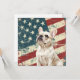 A watercolor portrait of a beautiful white French Bulldog is placed against a grunge background of the USA flag. The back of this all occasion flat card has a text field for you to customize.