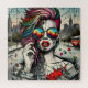 Unique ai art depicting a beautiful modern woman with pink and blue hair, sunglasses with a reflection of the city, urban background post-apocalyptic vibes.