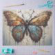 The butterfly wings show layered color variation with a mix of warm orange and cool blue tones, set against a neutral background for strong contrast. The dripping paint and fractured wing details give the artwork an edgy, gothic-inspired look.