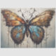 This decoupage paper features a detailed butterfly with blue and orange wings in a grunge, painterly style. The design includes cracked textures, ink drips, and distressed effects, creating a bold nature-inspired focal point.