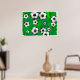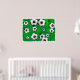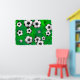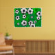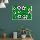 Illustration of lots of soccer balls rolling around against a green stained ripped and textured background. Image available on various gifts and products.