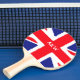 A fun table tennis / ping pong bat decorated on one side with the red, white and blue of the Union Jack, the flag of the United Kingdom. The Union Jack has been designed with 'fuzzy' edges to its lines, for a more casual look, and can be personalised with your initials or monogram. The reverse side of the bat is black.