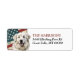 The left side of these return address labels feature a watercolor portrait of a beautiful Great Pyrenees dog placed against a grunge background of the USA flag. Your custom text is in matching red and black at the right.