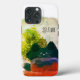 illustration of Blue and Black fluffy cat hidden behind block and grungy landscape with a tree.an iPhone Case gift special for those who are cat lovers.