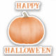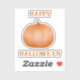This kiss cut sticker features a plain orange pumpkin with separate grungy “Happy” and “Hallowe’en” text in a darker burnt orange. You can also edit the two lines of text to your own text right on the product page for this sticker.