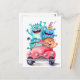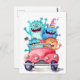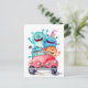 Gruppe lustiger Monster fährt mit dem Auto. Urlaub Postcard