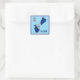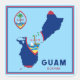 The national flag of Guam is infused into the shape of the island and is alongside the coat of arms/seal of the country. The added text is the country name in two forms, English and Chamorro.