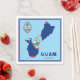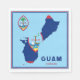 The national flag of Guam is infused into the shape of the island and is alongside the coat of arms/seal of the country. The added text is the country name in two forms, English and Chamorro.