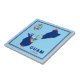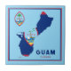 The national flag of Guam is infused into the shape of the island and is alongside the coat of arms/seal of the country. The added text is the country name in two forms, English and Chamorro.