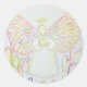 A white light guardian angel holds a heart and is surrounded by rainbow hearts at the angel's feet. A golden yellow halo is over the angel's head. The feathers on the angel's wings form into hearts. Painting was rendered with watercolor pencil on paper. Customise this inspirational sticker with your own words to make special guardian angel decals for events!