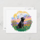 A guardian angel appears in the sunlit morning sky as a black Labrador Retriever sits in the soft green grass watching a dove fly off.