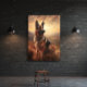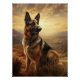 A majestic German Shepherd in a lush pasture, capturing its alert posture and connection with nature. The soft sunlight highlights its coat and the serene surroundings.
