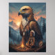 - The **background** features pine trees, mountain peaks, and a **sunset sky**, creating a serene and mystical atmosphere.