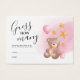 A girl teddy bear baby shower game featuring a simple plain white background, a watercolor bear, pink balloon, gold stars & a babies bottle, and a "guess how many" template that is easy to personalise.