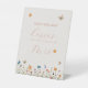 💐 Bohemian cream and terracotta script butterfly themed bridal shower guess how many kisses for soon to be Mrs games pedestal signs. This design is showing a perfect blend of cream light colours with beautiful colourful vibarant wildflowers at bottom along with perfect shiny blend of pink and purple along with cute 🦋 coloruful pink and purple butterflies making it a perfect choice for bridal shower signs