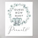 Cute gender-neutral game sign for your baby shower with "Guess How Many Peanuts" written simple typography and a stylish script with a heart swash and a pastel mint green watercolor of a baby elephant in a eucalyptus wreath. Place a jar filled with peanuts underneath and ask your guests to guess how many peanuts are in the jar. The winner will be the guest who gets closest without going over. Matching guess cards are available in our Elephant Eucalyptus Baby Shower Collection.