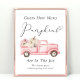 Cute game sign for your baby girl shower with "Guess How Many Pumpkins" written simple grey typography and a stylish script with a heart swash and watercolors of a vintage truck loaded with pink and cream pumpkins and florals. Place a jar filled with candy pumpkins underneath and ask your guests to guess how many are in the jar. The winner will be the guest who gets closest without going over. Matching guess cards are available in our Pink Pumpkin Vintage Truck Baby Girl Shower Collection.
