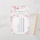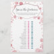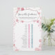 This baby shower game card features a script modern font on blush pink and rose gold dots background, perfect for a baby girl!