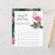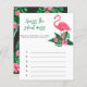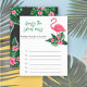 Baby shower invitation design features pink flamingo with lush green palm leaf fronds and tropical hibiscus flowers. "Aloha Baby". A tropical floral pattern with black background colour dresses up the back of the card.