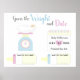 A baby shower or gender reveal cast your vote game, that involves guessing the babies due date and weight. The blue and pink typography text reads Guess the weight and date. The design consists of a baby in a white blanket on weighing scales, and a calendar showing the babies due date. The blue and pink baby bottles are designed to contain the guests guesses.