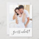 Upload your pregnancy announcement photo to this simple and stylish announcement card. The design features hand lettering and a minimalist, gender neutral, black and white colour palette. It is lettered with guess what! on the front and "we're expecting" on the back. The template is set up for you to add your personalised message with your baby due date and sign off with your name(s).