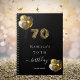 For an elegant 70th birthday party. A black background, decorated with balloons. Number 70 is written with a trendy balloon style font, leopard pattern. Personalise and add a name and a date. The word birthday is written with a modern hand lettered style script with swashes.